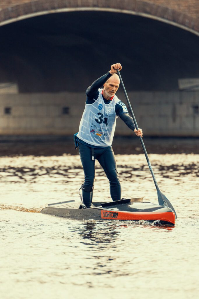 Insgesamt gingen rund 54 Stand-Up-Paddlerinnen und -Paddler auf die 10 Kilometer lange Strecke über die Alster. Die Strecke führte zunächst mit Gegenwind über die ersten fünf Kilometer bis zum traditionellen Wendepunkt am Tannenbaum auf der Binnenalster. Auf dem Rückweg erwarteten die Teilnehmenden dann Rückenwind und Welle, was für ein schnelles und spannendes Finish sorgte. Ergänzt wurde das Starterfeld durch 5 OC1-Paddler sowie 8 Funrace-Teilnehmende.