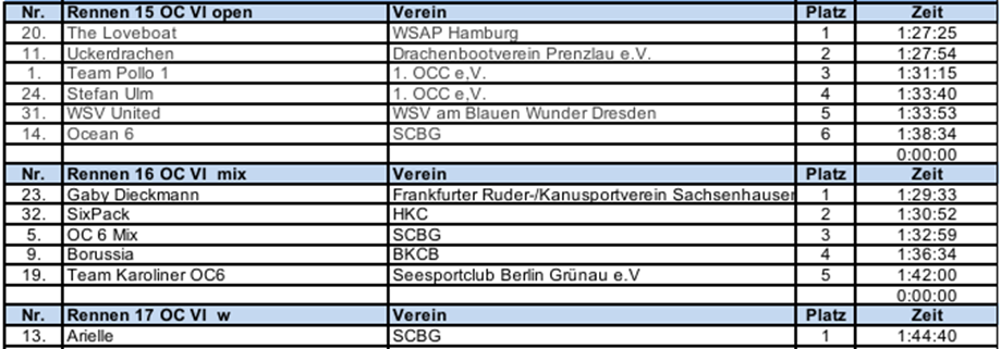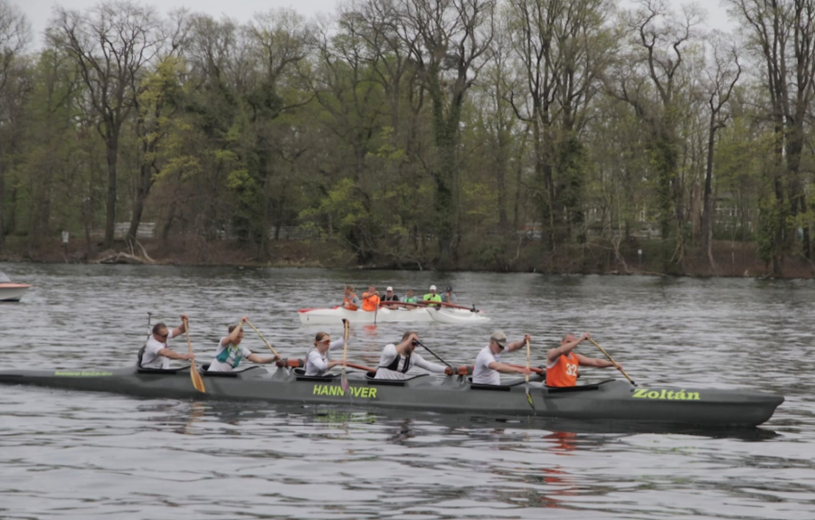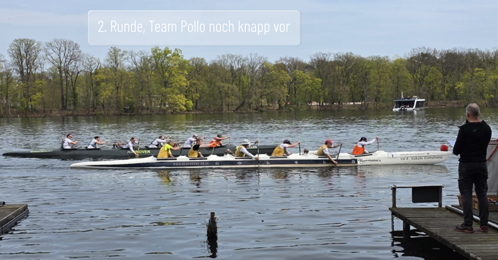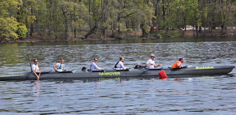 Überraschenderweise machte das Männerteam Pollo auf Platz 3 dann in einer Wende der 1. Runde „das Tor sperrangelweit auf“ und ließ die Frankfurter innen vorbei. Damit hatte das SixPack dann erstmal einen neuen Gegner vor sich – wenn auch in der falschen Kategorie. Die Frankfurter machten sich auf, das Männerboot auf Platz 2 einzuholen, und das Sixpack battelte sich mit Pollo Seite an Seite fast bis zum Ende des Rennens. Als es „noch 1x Maschsee“ hieß, setze sich der HKC ab und beendete das Rennen als 2. in der Mix-Klasse und 4. insgesamt. Für eine neu zusammengesetzte Crew ein toller Erfolg, denn die Teams vom Gastgeber Borussia und der SCBG aus Grünau hatten deutlich mehr OC-Erfahrung im Boot.